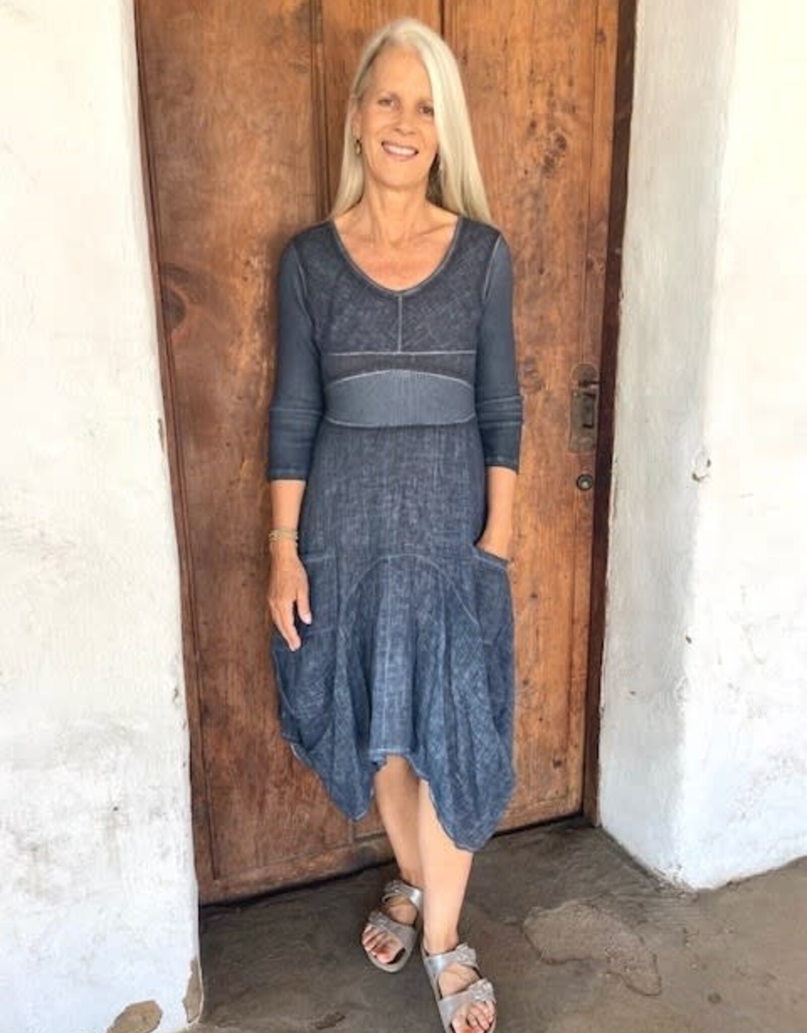 Created and produced in Italy, the MAGIC dress has a form fitting bodice with a cotton rib back and waist inset to ensure a flattering silhouette, front pockets and hi-low hemline. Colors are garment dyed and may have minor variations and vary slightly from photo. Sandwashed colors offer a uniquely distressed look that will lighten and change with washing.